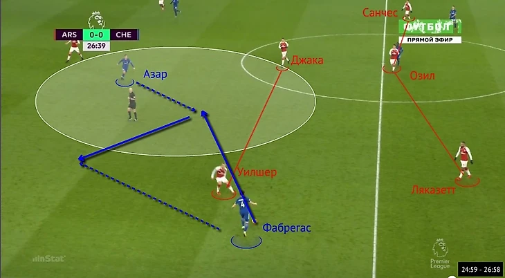 По факту «Арсенал» давал сопернику слишком много пространства в центральной области, которое могло быть использовано «Челси» в сочетании с перегрузом на левом фланге. Однако «завалившийся» налево Азар лишал команды этой опции, всего лишь раз в связке с Фабрегасом разыграв центральный участок с выводом Бакайоко на удар.