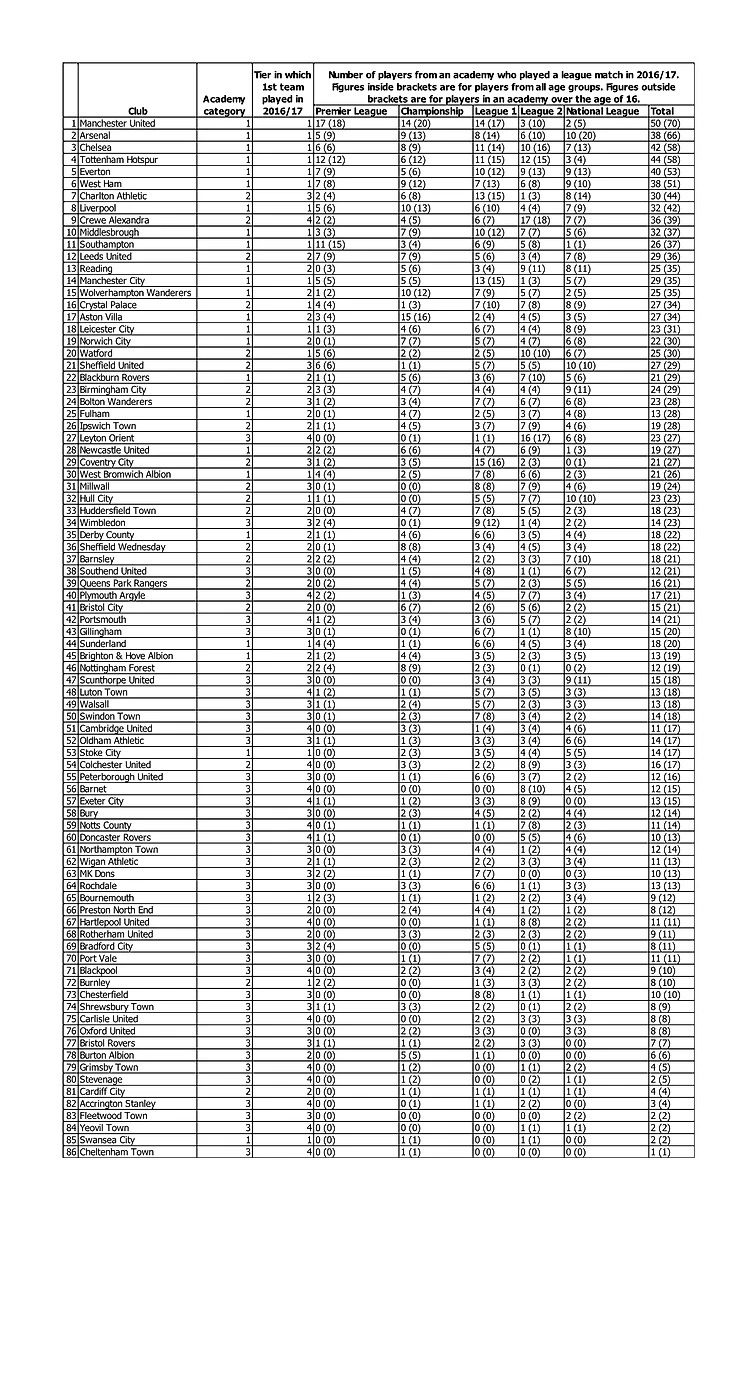 В данной таблице представлен рейтинг 86 клубов с академиями категорий 1-3, выпускники которых в сезоне 2016/17 играли в Англии на профессиональном уровне.