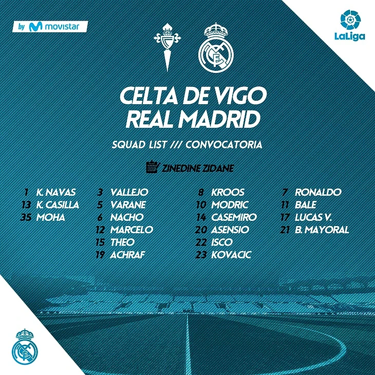 Зидан вызвал на игру 19 футболистов. В матче не сыграют дисквалифицированный Карвахаль, травмированные Рамос и Бензема, а также оставшиеся вне заявки Льоренте и Себальос.