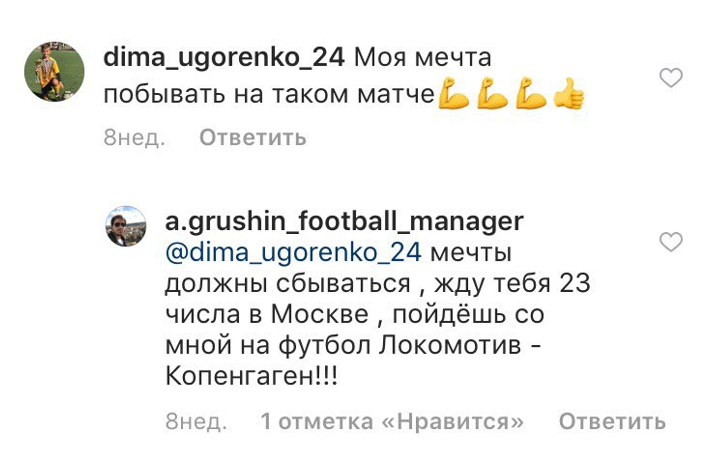 - Ну и последнее. В твоем инстаграме видел удивительную историю: мальчик под твоей фотографией с матча Лиги Европы написал, что мечтал бы побывать на матче такого уровня и ты пригласил его, объяснив тем, что мечты должны сбываться. Чем в итоге закончилась эта история?