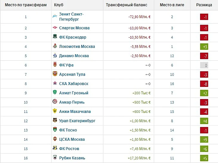 Трансферный баланс клубов РФПЛ и их место в лиге на данный момент