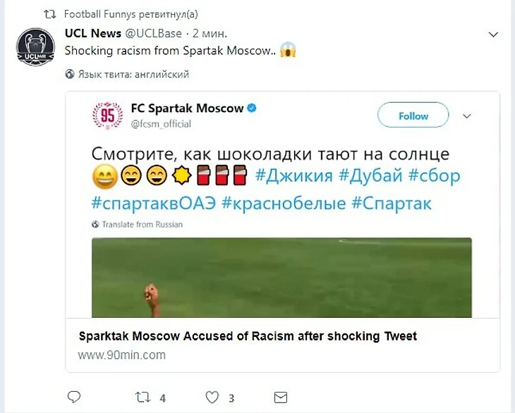Было очевидно, что этот твит перерастет в большой скандал. И со стороны выглядело очень странно, что его не удаляли. Да, Джикия запостил непродуманную шутку, но почему пресс-служба ее не замечала? Потом из ОАЭ прилетел инсайд, что вроде как все твиты Джикии заверяются Леонидом Трахтенбергом – тогда все стало понятно. Оставалось только ждать. Прошло каких-то пару часов, как история появилась в Mirror и других британских СМИ. Еще через час – в юмористическом твиттере Football Funnys, где в принципе нет ставки на оперативность. «Спартак» обосрался настолько сильно, что даже без английских соцсетей попал с этой историей в англоязычные медиа со скоростью даже не Квинси Промеса, а Овусу-Абейе.