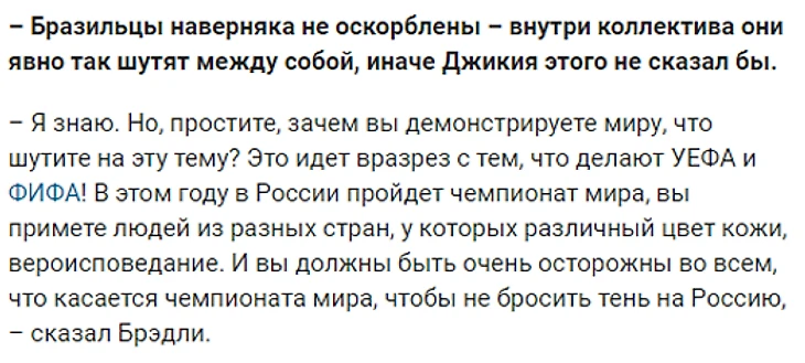Но спорить с дураками - это вставать на их уровень. И по всему этому западному либеральному тоталитаризму уже много книг написали, не то что статей. Я лучше скажу несколько слов нашим комментаторам, тут же включившимся в перепалку. Слова "Джикия должен выбирать выражения" оскорбляют меня куда больше, чем его неудачная шутка. Георгий говорил в рамках тех свобод, которые присутствуют в моей стране. И любая попытка ограничить его свободы со стороны журналистов является для меня неприемлемой. В России отсутствует дискриминация по цвету кожи. Более того, её исторически никогда не было у нас. Игрок "Спартака" не нарушал никаких законов и не может быть подвергнут обструкции за какие-то завиральные идеи в ваших головах.