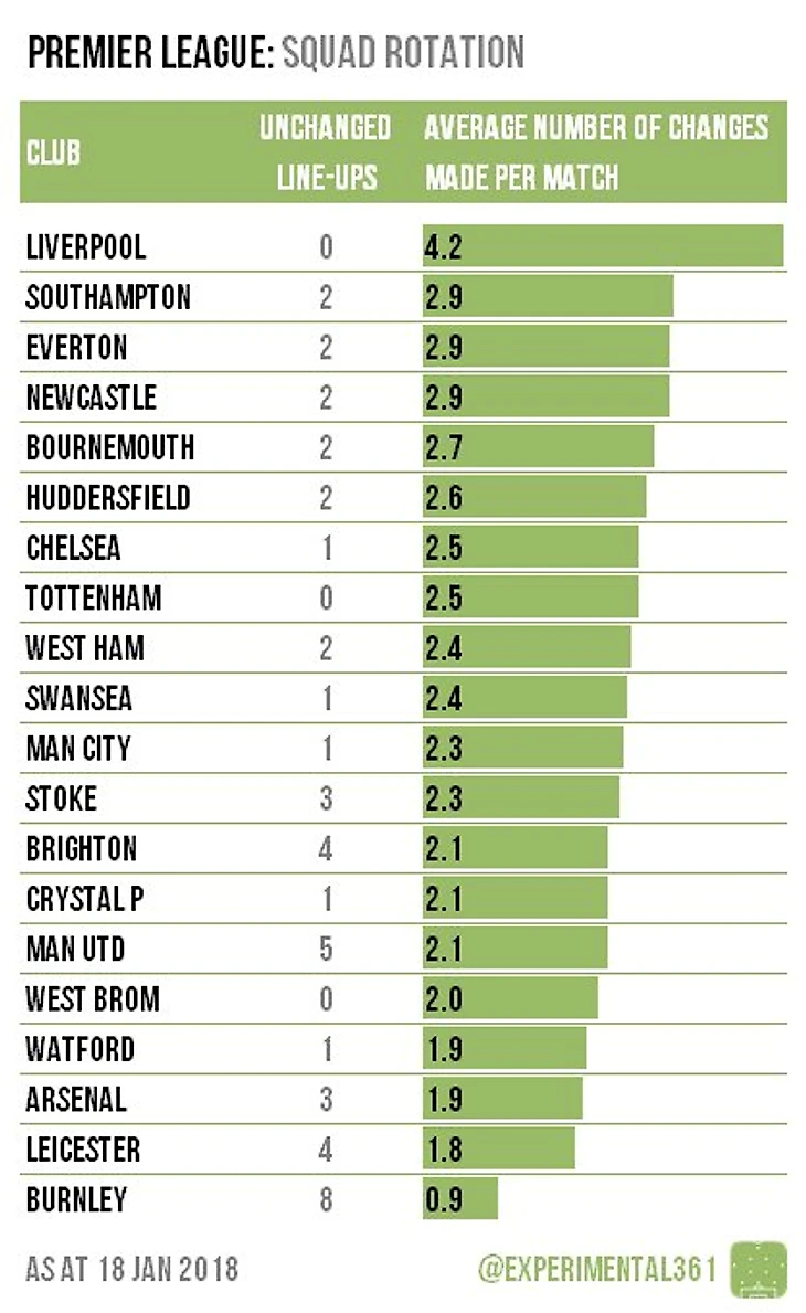 «Ливерпуль» тут, конечно, вне конкуренции. Ни разу за 23 тура не играли тем же составом, что и в прошлом матче + меняют игроков довольно часто.
