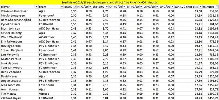 По ожидаемым голам Амин входит в ТОП-20 голландской лиги с показателем xG/90 – 0.33, что неплохо для чистого вингера, особенно в Аяксе, где командный xG приходится делить с такими звездочками как Долберг, Нереш, Хюнтелар и Зеиш. Средняя дистанция удара немецкого (ливанского?) таланта 14.63 метра, что является 4ым результатом лиги. В среднем Амин бьет более 3х раз за игру, то есть выборка ударов на 9и матчах этого сезона довольно неплохая. Учитывая, что перед своими ударами игрок как правило сам на дриблинге доставляет мяч на ударную позицию (в отличии от большинства соседей по ТОП рейтингу), это довольно однозначно говорит о его полезности по вкладу в общий xG Аякса.