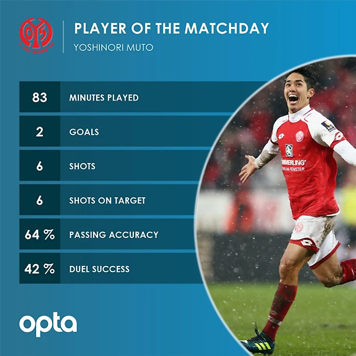 Вышеупомянутый Йосинори Муто на последней минуте первого тайма сравнивает счет, а через восемь минут после начала второго оформляет дубль. И снова не обошлось без везения и дождя. Через десять минут после второго забитого японцем мяча свой второй гол в сезоне забил Геррит Хольтманн. Он и оказался в этот вечер победным. В самом конце матча Даниэль Гинчек сократил разницу в счете, но на другие подвиги подопечным Ханнеса Вольфа времени и сил не хватило.