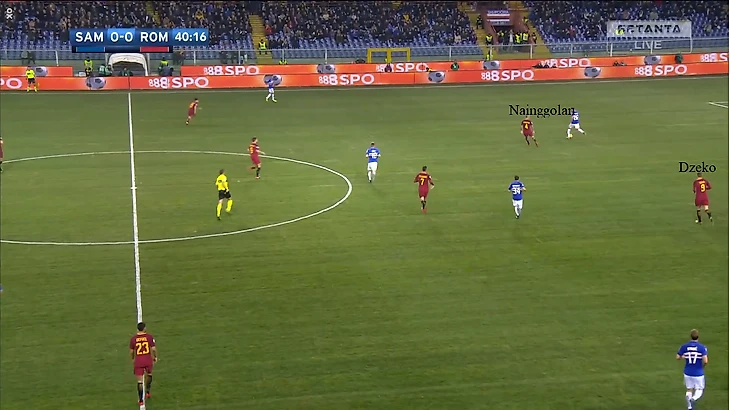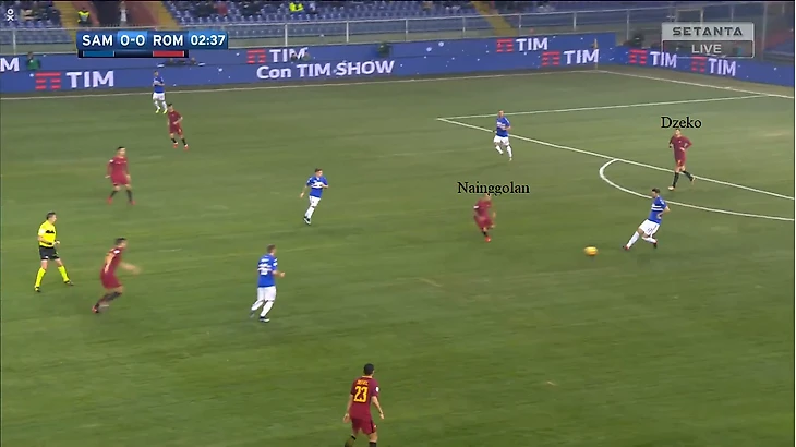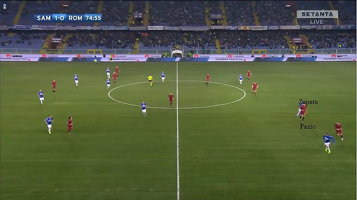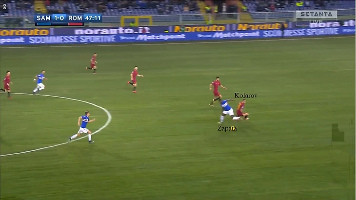 Сапата делает передачу на Праета, тот уходит из центра на правый фланг. Бельгийца на себя берёт Фазио. Флорензи тоже опекает соперника, Коларов отстал, а Манолас... А чем, собственно, занят Манолас? Он просто идёт параллельным Сапате курсом.