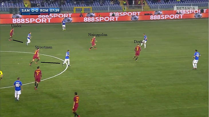 Однако, по мере продвижения соперника вперёд игроки Ромы постепенно "включаются": Джеко и Найнголан выдвигаются выше остальных, на место бельгийца оттягивается Ундер, в результате, построение полузащитников не рушится, просто прооисходит замена переменной. Как видно на изображении ниже, каждый полузащитник Ромы отвечает за определённого игрока, в то время как Джеко и Наинголан вдвоём прессингуют одного защитника.