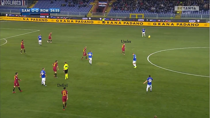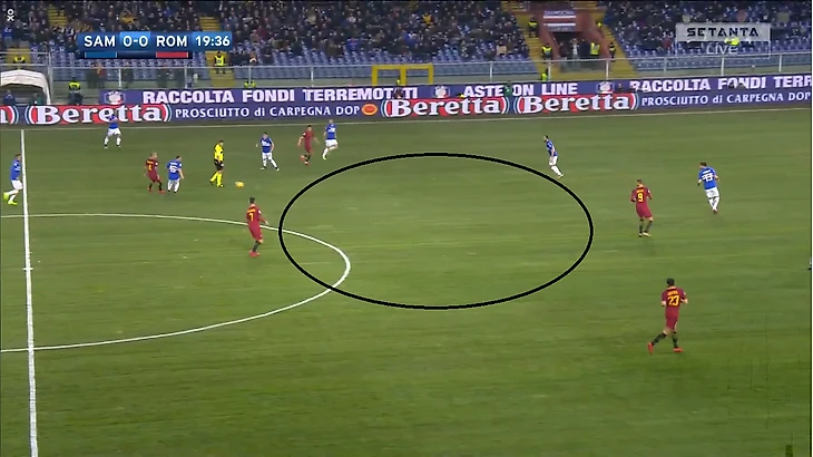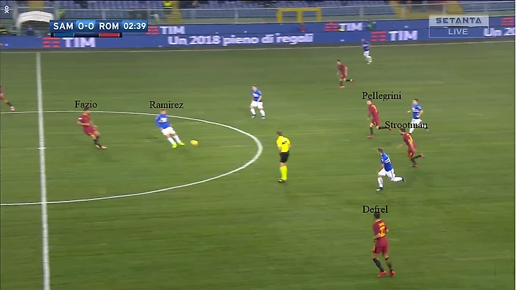 Пройдя свою половину поля за 6 секунд (посмотрите на времена, указанные на изображениях), Самподория показала несостоятельность прессинга Ромы.