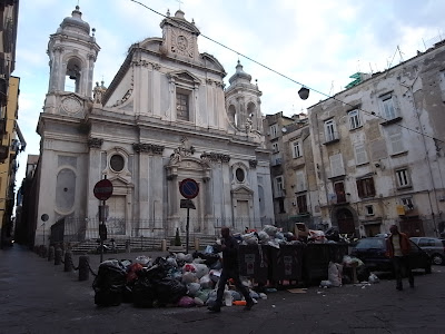 Однако, большое количество мусора было размещенно на временных объектах - город сидел на бомбе замедленного действия. Дней за 10 до нашего приезда, после того как демонстранты заблокировали подьезд к свалке у городка Терциньо, в Неаполе опять перестали убирать мусор. У местного населения лопнуло терпение, когда они узнали, что правительство собирается открыть новую свалку на 3 миллиона тонн (самую большую в Европе) на территории Национального Парка Везувия, прямо на склоне вулкана над Терциньо. (Городок находится всего в нескольких километрах от Помпей по "ту" сторону Везувия от Неаполя.) Несчастные жители, которые и так лезли на стену от вони от уже существующей у них под боком переполненной и благоухающей высоким уровнем токсичности свалки, обвиняли правительство в сговоре с Каморрой, указывая на отсутствие эффективных мер предотвращающих ввоз токсических отходов им прямо под окна. Такой была ситуация на 20-ое октября...