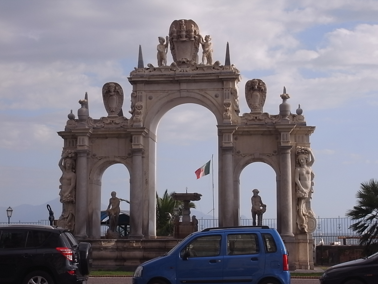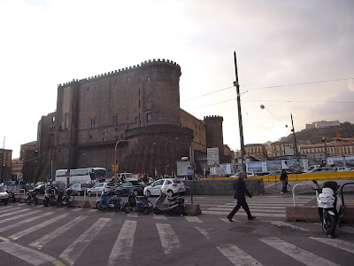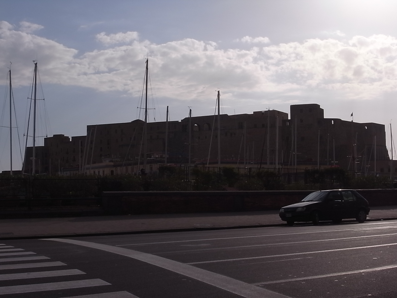 Вернувшись на "Порту Нолану" около 3-ех, мы неспеша отправились в сторону района Санта Лючия, где находился отель с билетами. Это уже не Помпеи, так что смотрим в оба. По корсо Умберто и виа Агустино Депретис (тоже перерытую) дошли да Нового Замка. Рядом с замком находился морской терминал, мимо которого мы пошли дальше по набережной, огибая Санта Лючию. На виа Сауро пили пиво группы выездюков. Пара из них бултыхалась в море. И вот показался фонтан дель Иммаколата,