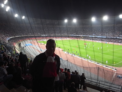 Были проблемы и с билетами - они появились совсем в последний момент. Купленные билеты прислать не успели, так что их надо было забирать из отеля в Неаполе, информацию о котором я записывал уже в дороге, дозвонившись до клуба по дороге в аэропорт. В отеле надо было появиться до 16:00 в день матча, что несколько обрезало день. Взвесив все, решили, что не мудрствуя лукаво надо с самого утра пилить в Помпеи. Вернувшись на виа дей Трибунали, нашли ресторанчик, сытно поужали, запив его просто ужасным ("залповым") красным вином, посмотрели как "Интер" Рафаэля Бенитеса сначала уничтожил "Тоттенхем", а потом едва не был сам уничтожем Гаретом Бэйлом, и отправились на боковую.