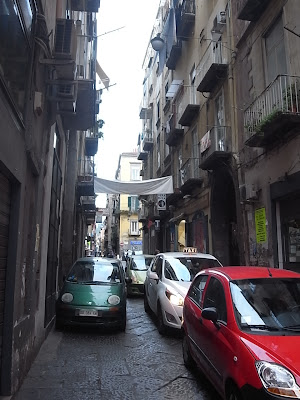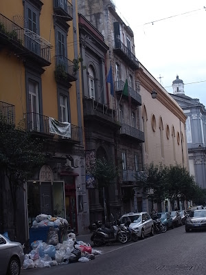 Вываливаемся из автобуса на пьяцца Гарибальди... Если Вас попросят описать итальянскую пьяццу, то что первое придет в голову? Залитая солнцем площадь с элегантными ресторанами и кафэ, где хорошо одетая почтенная публика заливает вкуснейший обед бокалом красного вина? Так вот, с площадью имени Гарибальди в Неаполе такая картина ничего общего не имеет. Вообще. Хмурый день, пространство забитое машинами и автобусами и снующими между ними скутеры, обшарпанные дома, никуда не движущаяся стройка, кучи мусора, толпа северо-африканцев на тюках, шатающиеся взад-вперед ободранные личности с какими-то мешками... Италия? Европа? Вроде так.... географически... Уходим с площади по Корсо Умберто, одной из главных улиц города, на данный момент друхполосной, так как полдороги перерыто. Полтротуара забито сомалийцами, торгующими всякими сумками, очками и прочим "дизайнеровской" хламом. Минут через 10 нам направо - виа Дуомо, сравнительно чистенькая и ухоженная,