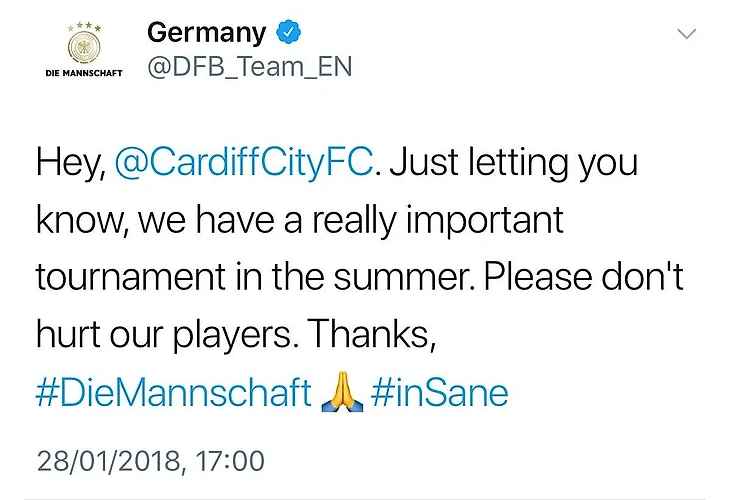 После этого твиттер сборной Германии попросил «Кардифф» не травмировать немецких игроков.