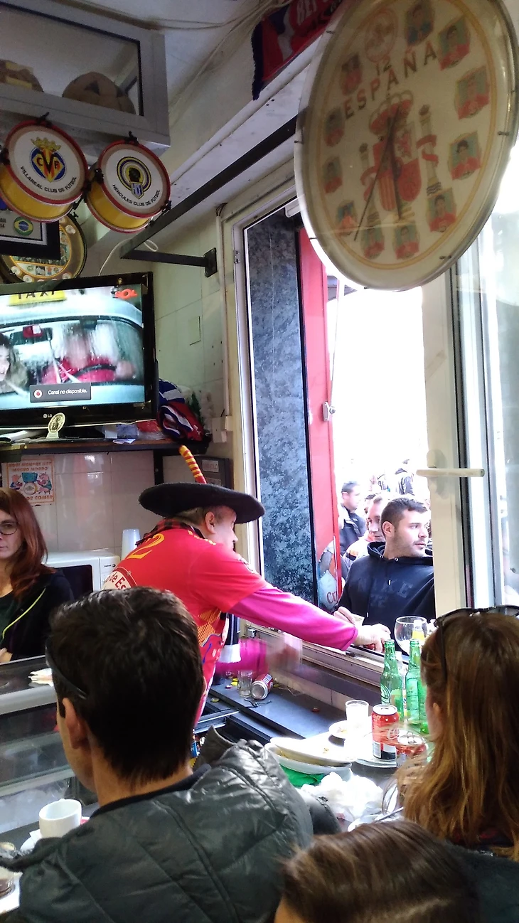 После встречи команды можно отдохнуть и погреться на январском солнышке, сделать фото на фоне стадиона, обсудить с друзьями стартовый состав, познакомиться с другими болельщиками и в сотый раз полюбоваться на многочисленные семьи, дедушек с внуками, передающими традиции боления и футбольного взаимоуважения от поколения к поколению. Лично я пошла проведать своего любимого барабанщика Маноло, у которого выдался довольно жаркий денёк. Его небольшой бар, любовно называемый "Твой музей спорта", был переполнен завсегдатаями и просто зеваками, пришедшими собственными глазами увидеть легендарного болельщика, который с должной ему скромностью наливал пиво и между тем общался и фотографировался с традиционным кубком.