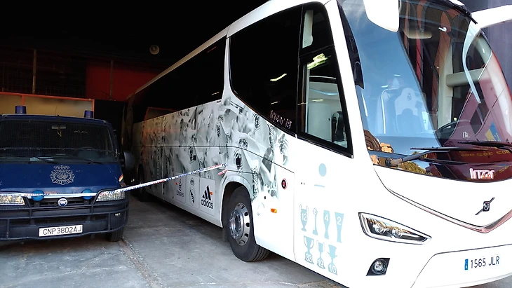 Чуть позже автобус "Реала" можно было лицезреть припаркованным с задней части стадиона в сопровождении двух полицейских машин, скованных, эх, одной цепью. И если обычно к автобусам других команд можно беспрепятсвенно подойти, чтобы сделать фото, то здесь выстроился целый кордон полицейских с автоматами, будто речь шла не о королевском клубе, а о королевской особе во плоти.