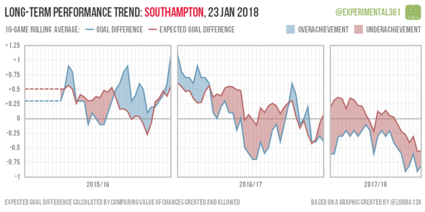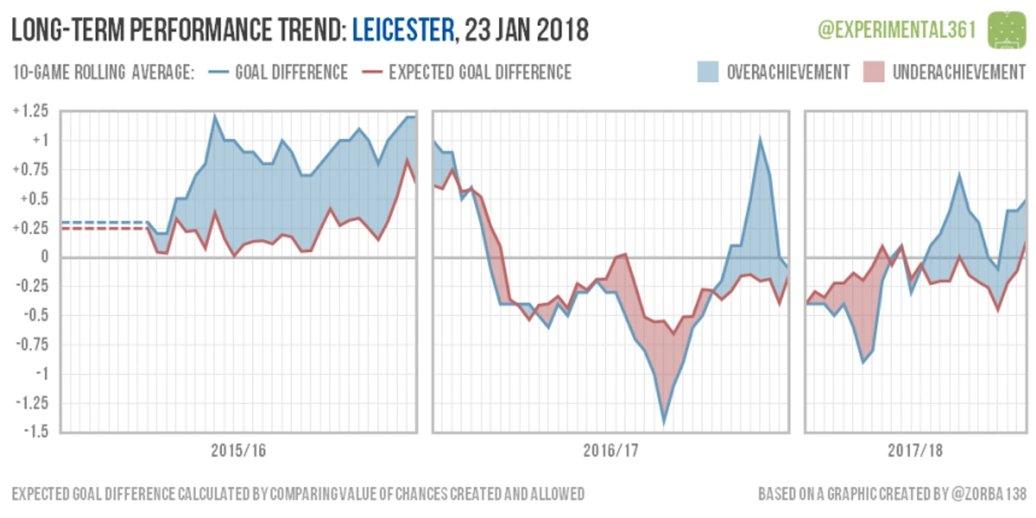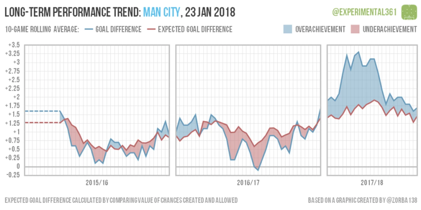 Сравнение этих двух показателей позволяет нам видеть не только изменения выступления клуба с течением времени, но также различия между goal difference и xG difference.