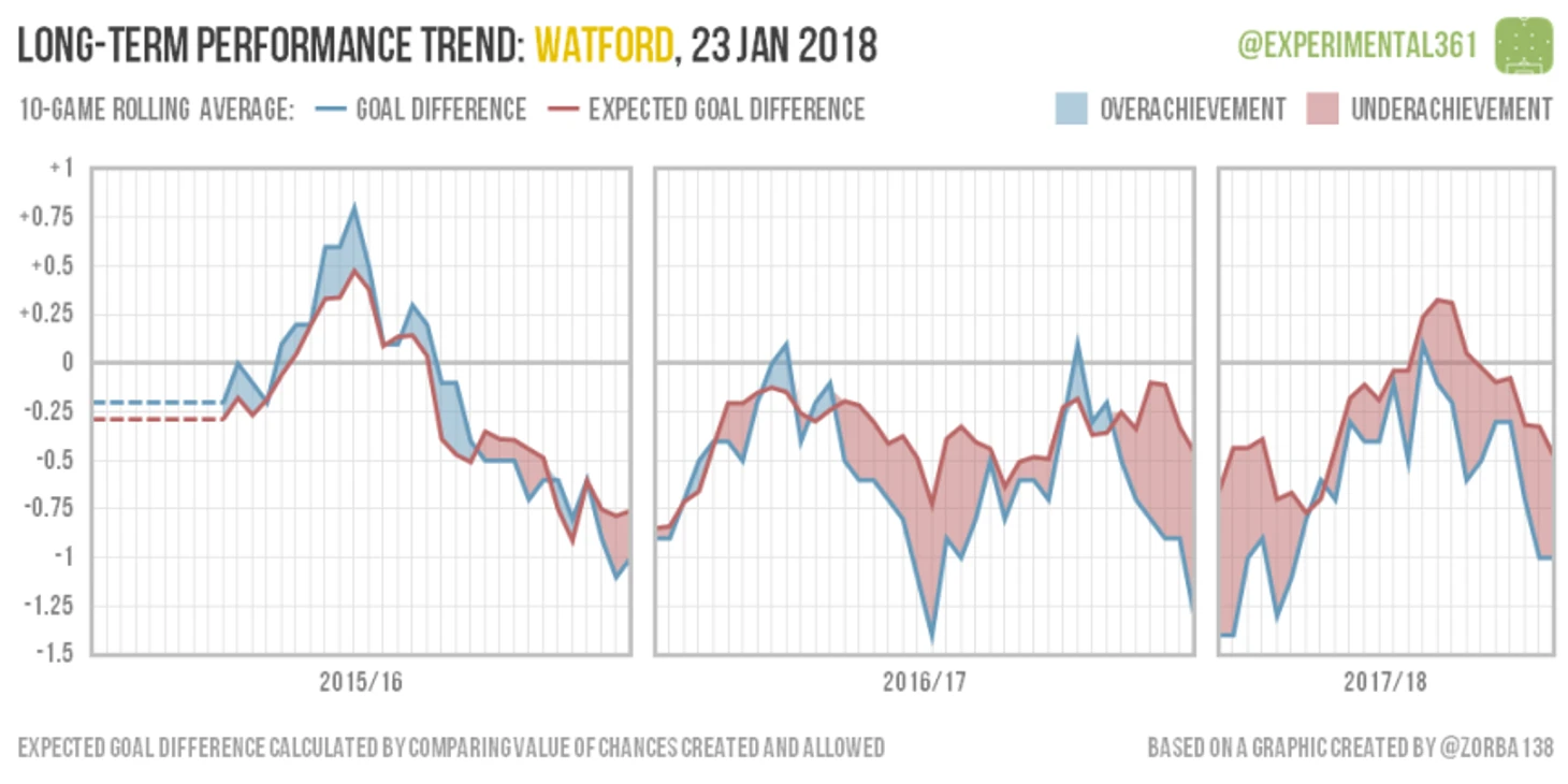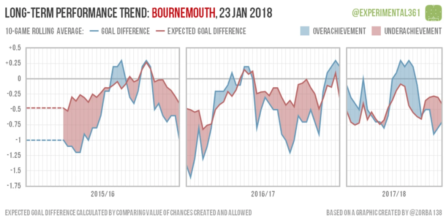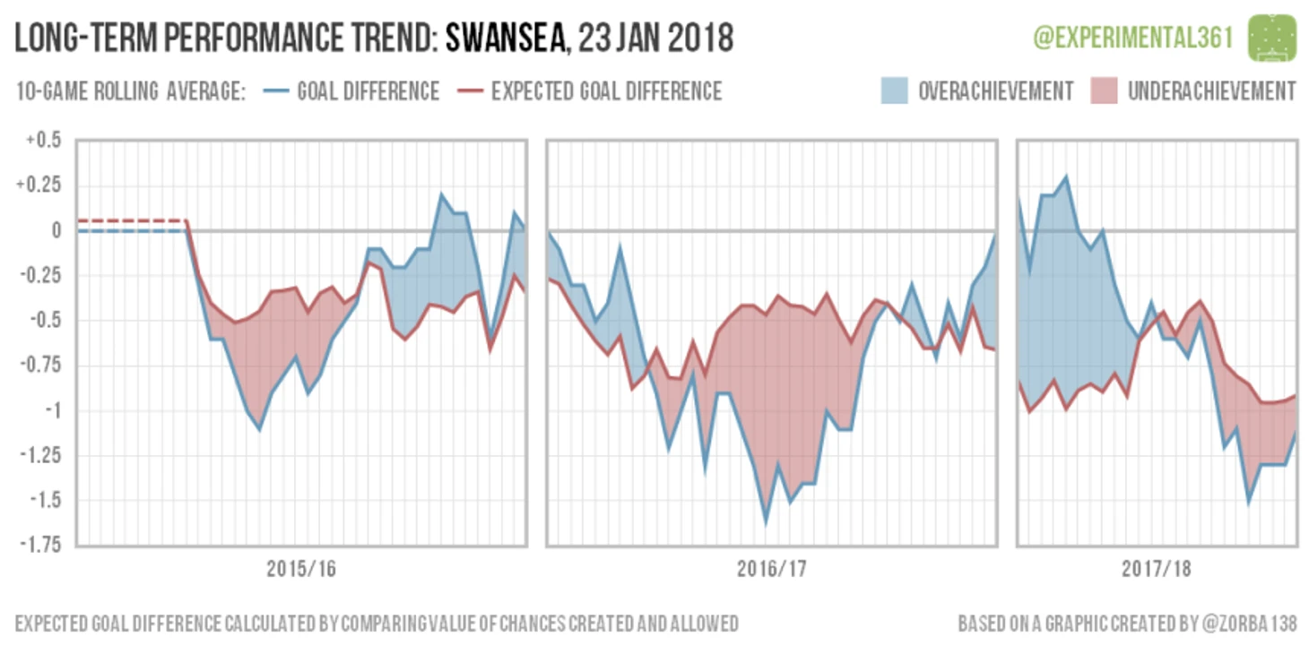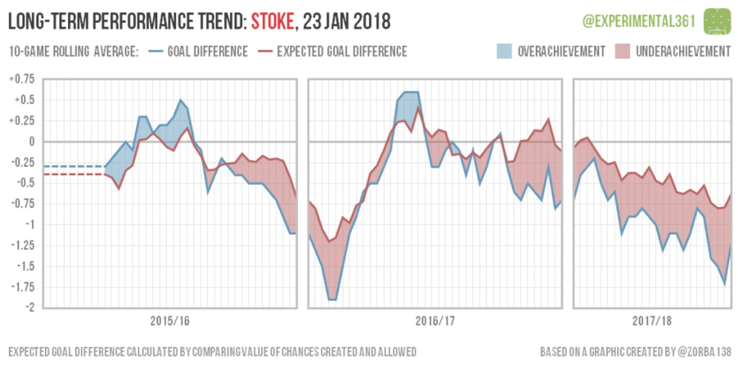 Сравнение этих двух показателей позволяет нам видеть не только изменения выступления клуба с течением времени, но также различия между goal difference и xG difference.