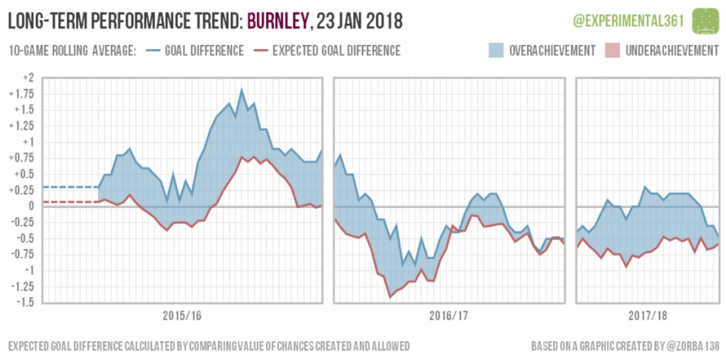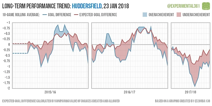 Синие заштрихованные области указываю на положение дел, когда показатель забитых/пропущенных мячей (goal difference) выше, чем создаваемые/допущенные моменты (xG difference).