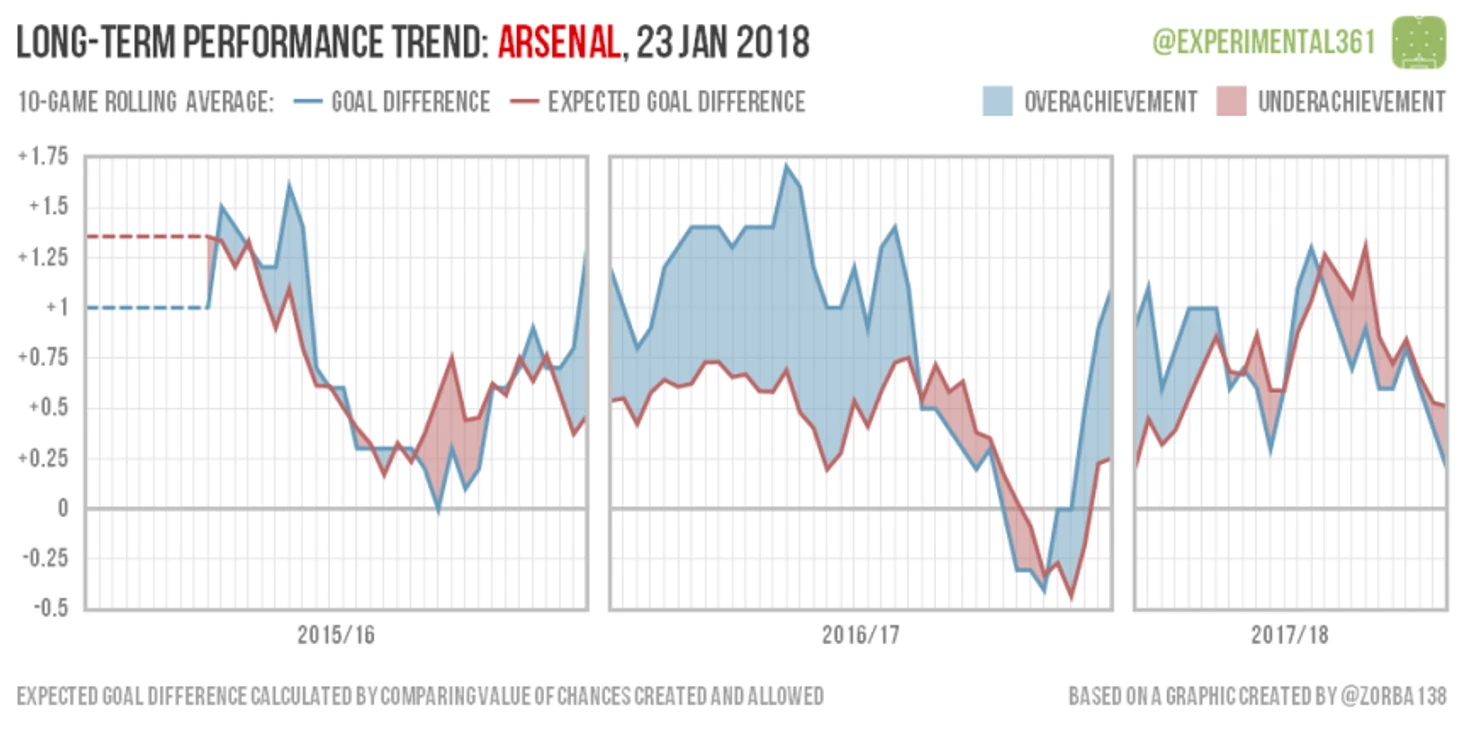«Арсенал» в этом сезоне демонстрирует не совсем стабильные показатели по goal difference и xG difference. Новички команды, возможно, помогут «канонирам» не допустить падение цифр в конце сезона (как в сезоне 16/17).