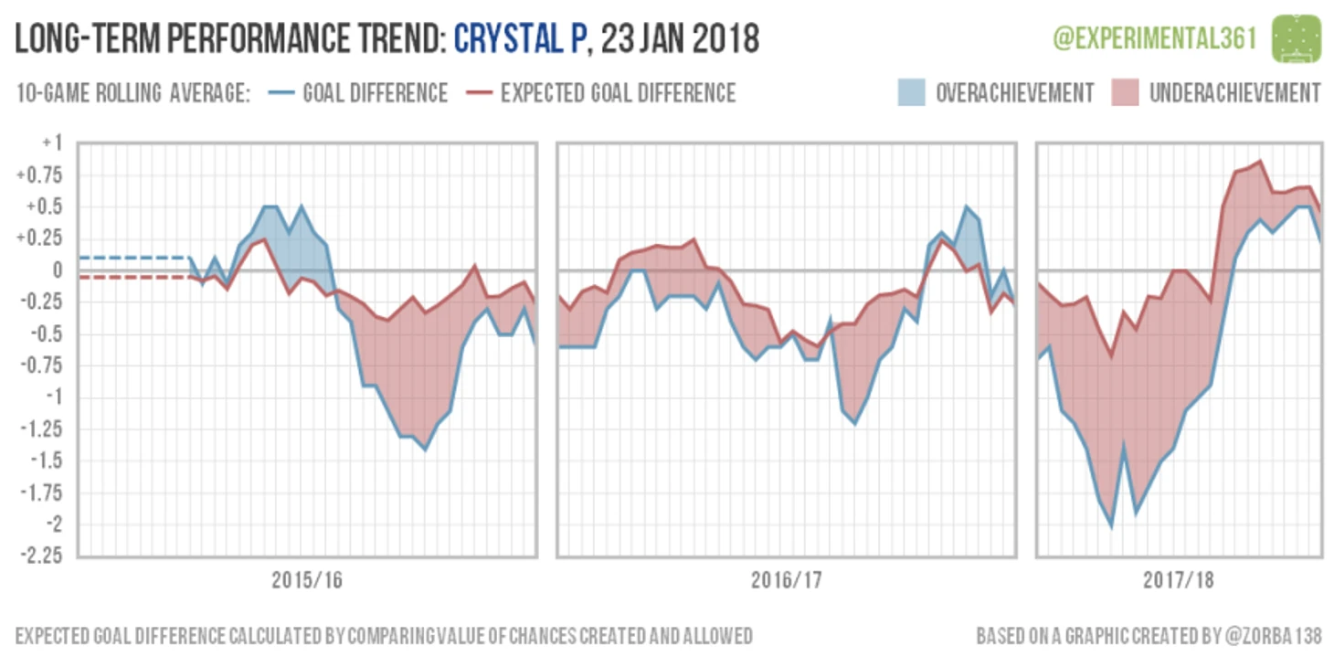 Ужасные показатели «Кристал Пэлас» в начале сезона (худшие с момента начала исследования) всё-таки выправились, и «Орлы» уверенно приближаются к неплохим цифрам.