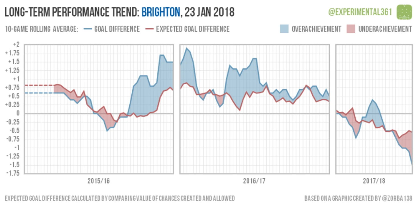 Показатели «Брайтона» по goal difference немного подскочив в осенней стадии чемпионата, вновь пошли вниз.