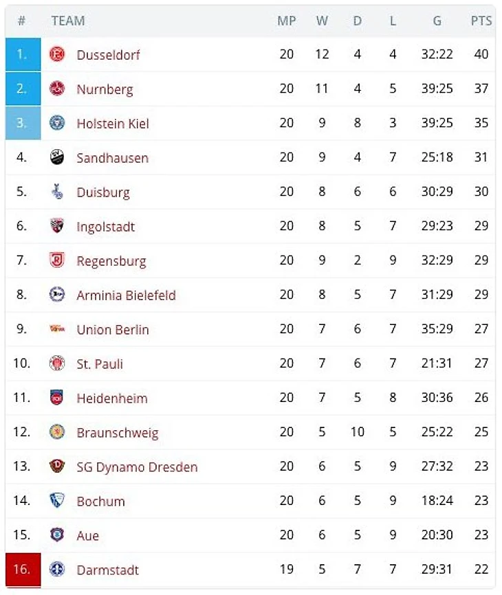 По итогам очередных игр во второй Бундеслиге, вылетивший в прошлом сезоне из первой лиги «Дармштадт» рискует по итогам этого попасть в третью, «Фортуна» борется за повышение, а «Санкт-Паули» делит очки с «Унионом» из Берлина в середине таблицы.