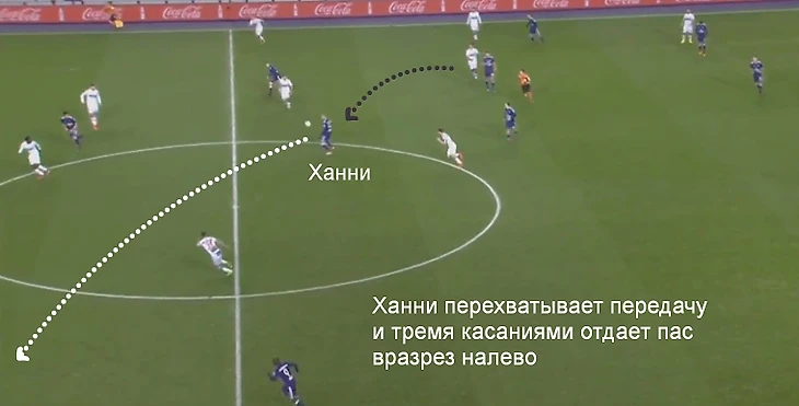 Очень важный момент: лишь 35,2% обостряющих передач Ханни оказываются точными. Но такой процент брака при продвижении мяча логичен.