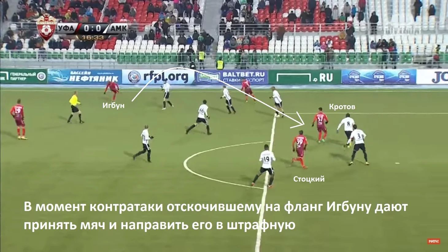 Насколько это может быть симпатично, показывает пример «Уфы», где центрфорварда играет Сильвестр Игбун. Он регулярно ускоряется на фланг под передачу из глубины, в то время как два других нападающих («Уфа» в фазе атаки использует схему 3-4-3) идут в штрафную площадь.