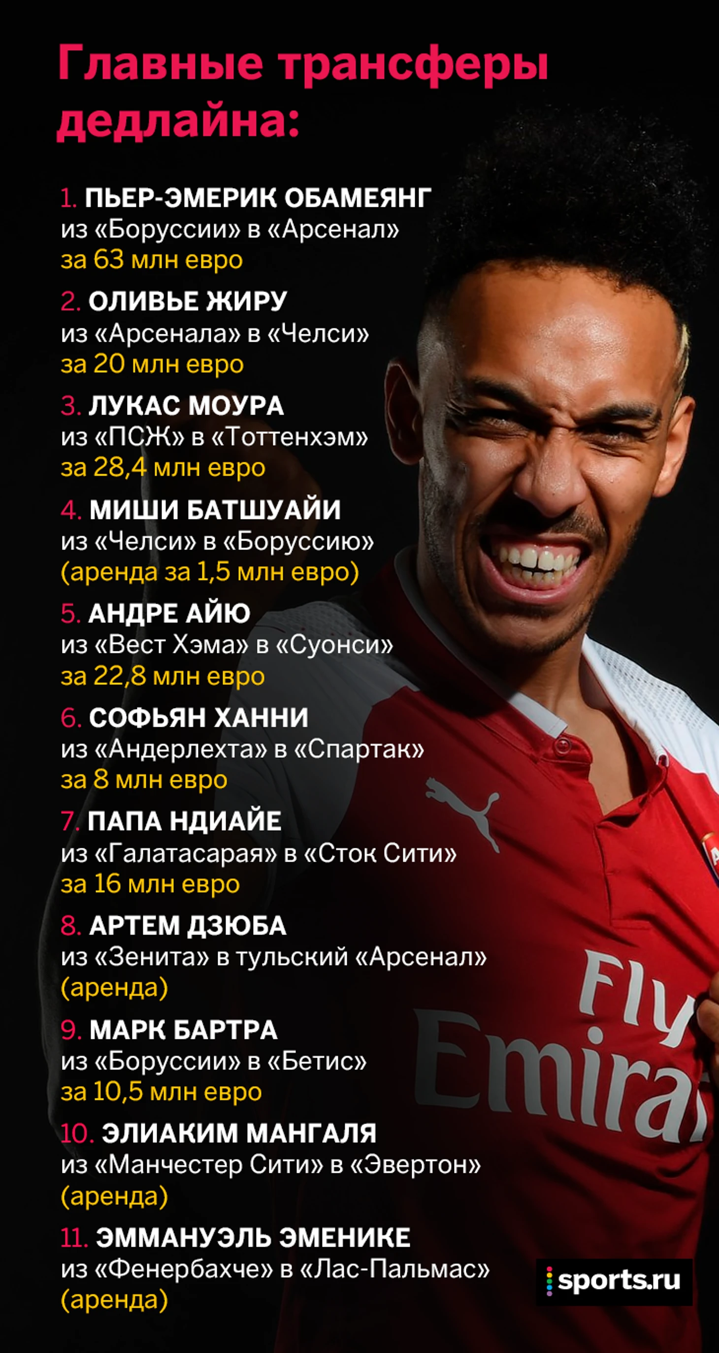 Пьер-Эмерик Обамеянг в «Арсенал»: кажется, «Арсенал» совсем не планировал этот трансфер, но перспектива взять супертопа в атаку оказалась слишком притягательной. Вестись на такую возможность (да и платить так много) – совсем не арсенальский ход. Предыдущее предложение – оскорбление и комплимент одновременно. Теперь у «Арсенала» есть сильнейший со времен пикового ван Перси форвард, но почти нет возможности эффективно использовать Ляказетта.