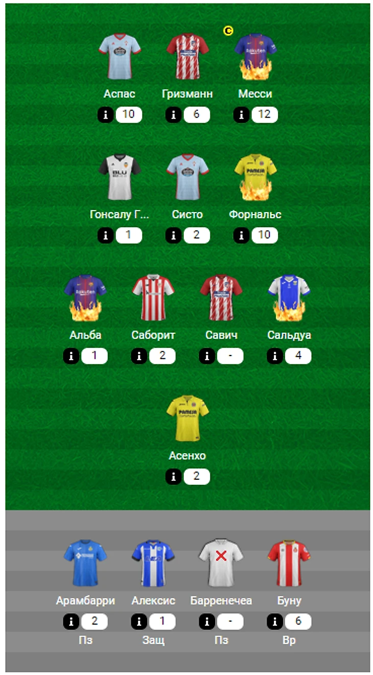 Мало того, что Барселона раз за разом штампует сухари, что приносит в копилку постоянные дополнительные 4 ФО защитникам, так теперь еще мы вправе ожидать от Жорди голевых свершений чуть ли не в каждой встрече. Он уже сделал в чемпионате 1+8, а если еще вспомнить о феерии в кубковом поединке с Сельтой(1+2), то думаю, что даже у самых отъявленных скептиков не возникнет желания играть без Альбы вторую половину сезона