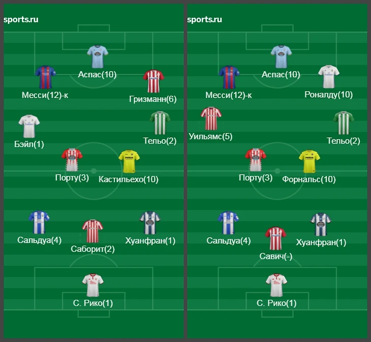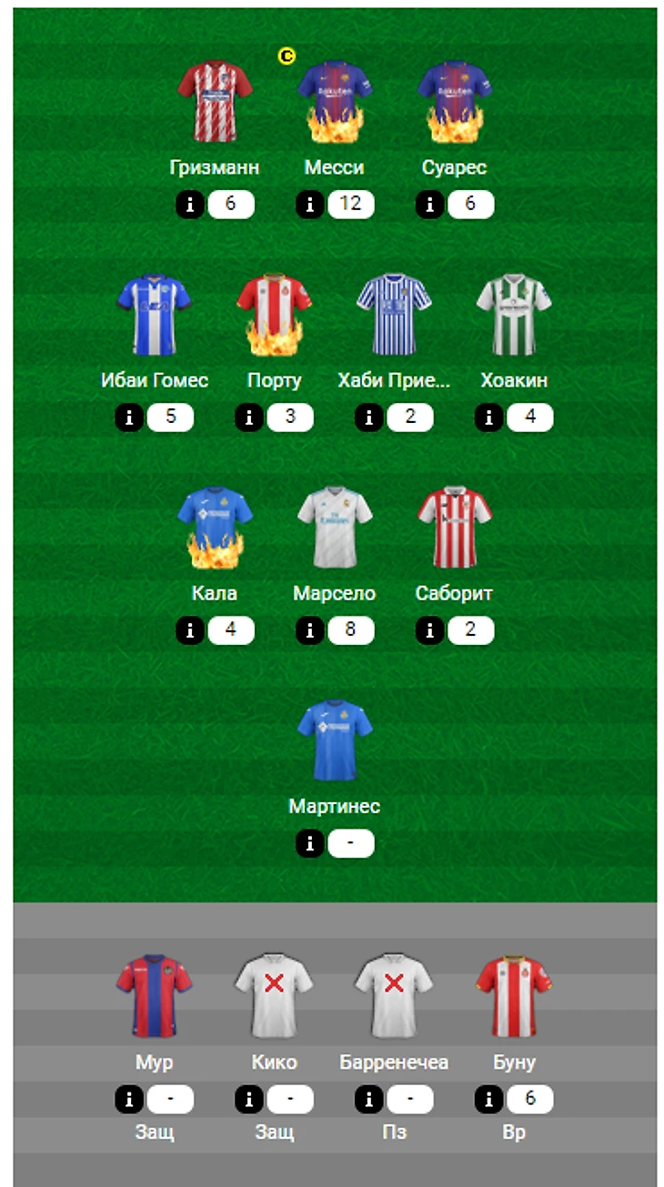 А теперь мы переходим к нашим веселым стартам. Без особых призов и без лишнего допинга мы с Экспертом каждый тур набираем сборную дополнительно загружая себя условием: не более ОДНОГО игрока от команды Примеры. Вот как это выглядело в прошлом туре: