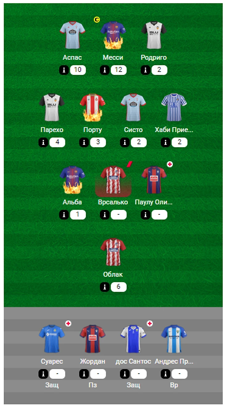 Именно сейчас это тебя спасает, потому как и травмированных юнитов в составе много и к туру команда не очень готова. Первым делом разбираемся с травматами: Суарес заменяется Калой, Дос Сантос освобождает место для Джене.