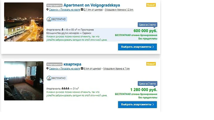 В Екатеринбурге, Самаре, Волгограде все намного дешевле. Цены за пару ночей около 60 000 р. Но в Сочи много вариантов и за 5000.