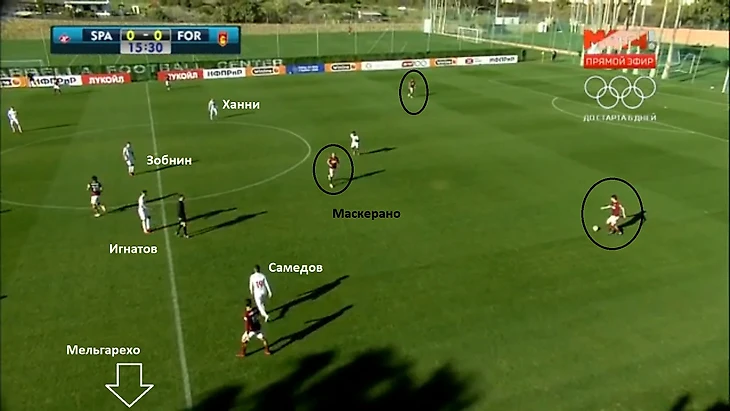 Необходимо отметить, что по ходу матча «Спартак» перестраивался. Как с ним обычно это и бывает. Красно-белые начинали игру по схеме 4-4-2 (впереди с Зе Луишем играл Ханни), но уже на 8-й минуте перешли на модуль 4-5-1 (Зе Луиш остался впереди, на флангах полузащиты стали действовать Мельгарехо и Ханни, а в центре поля Игнатов, Зобнин и Самедов). Таким образом наша команда среагировала на тактику соперника: при начале атак опорник Маскерано и два центральных защитника отвечали за развитие комбинации, тогда как их партнеры поднимались выше, чтобы создавать бреши в чужой обороне. Высоко в прессинг наша команда не лезла, поэтому оборону требовалось насытить.