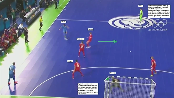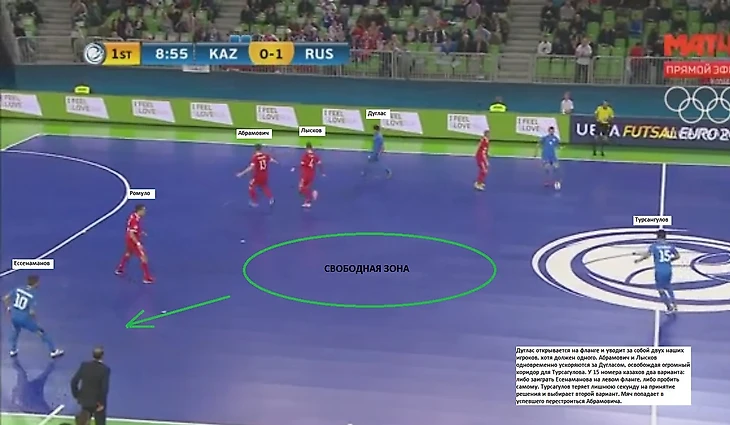 Что касается подключений Игиты, то здесь у казахов по-прежнему всё в порядке. Кипер в очередной раз доказал, что культура паса у него отменная. При использовании пятого Казахстан далеко не каждую атаку старается доводить до завершающего удара. Но когда есть хотя бы маленькая возможность расчехлить пушку, почему бы этого не сделать? Дуглас точно пробил в тот момент, когда на паркете только-только появилась наша вторая четвёрка. И снова приходится говорить о недопонимании между футболистами.