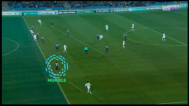 Главный тренер Мишель Тер-Закарян, на домашний матч против «Лиона», выбрал расстановку 3-4-3, где Мукиеле играл правым латералем, закрывая всю бровку. Задача на игру, была создать численное преимущество в центре поля, не дав, тем самым возможности «Лиону» атаковать, через центр. Но атаки создают «Монпелье», через края, создавая «перезагрузку» на одном краю и переводят на другой, создавался клатч 1в1.