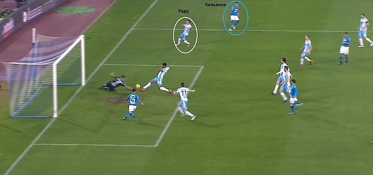 Полузащитник сразу увидел забегание Кальехона. Взгляды их встретились, и образовалась химия, которую кожей почувствовали даже болельщики у экранов. Испанец воспользовался неразберихой между Луличем и Раду (Лулич не попал в кадр, он находится чуть правее от Кальехона) и вбежал в свободную зону.