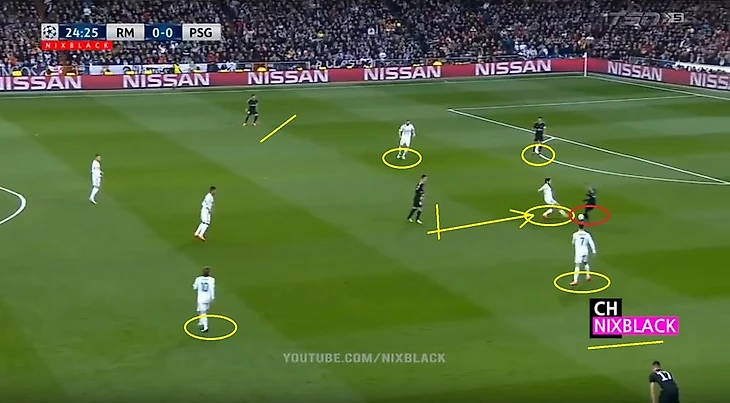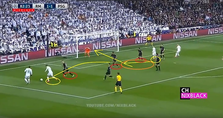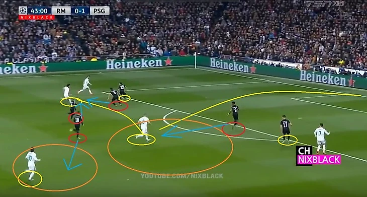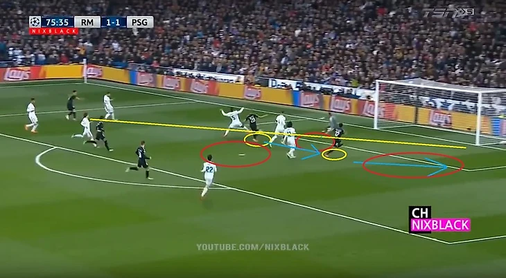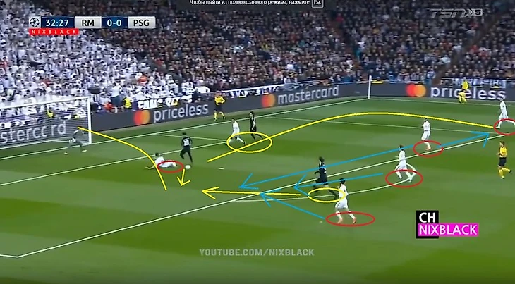 ПСЖ атакует правым флангом, Марсело загулял в атаке. Рамос бездумно выдвигается на перехват, оставляя зону в центре. Каземиро в итоге не перекрывает ни зону в центре, ни оказывает давления на игрока, исполнявшего навес. Начо вынужден делать подкат дабы прервать удар в касание, Иско и в особенности Модрич (как потом видно на повторе с другого ракусра) не успевают накрыть Рабью. Тот грамотно оценивает ситуацию и пробивает мимо Начо в противоход Навасу, 0-1.