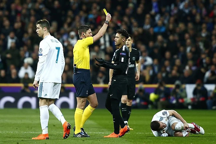 Ну и ещё один любопытный момент перед заменой Кавани: Реал атакует по центру, Модрич нарывается на Рабью, который грамотно занял позицию, ныряет и теряет мяч. Адриену просто так дают жёлтую карточку и назначают опасный штрафной (который, к слову, как обычно порет Криштиану). Эх, не таким я помню Реал, не таким…