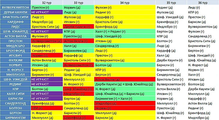 *Все цвета проставлены исключительно по моему мнению. Они никак не привязаны к бук. котировкам, поскольку для Чемпионшипа все довольно условно и быстро меняется.