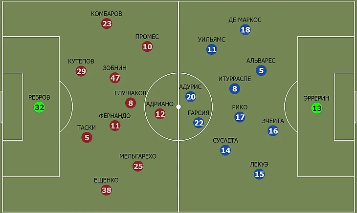 За счет сдвоенных флангов в обороне «Атлетик» лишил «Спартак» основного преимущества в этих зонах – скорости. Часто оказываясь в активной фазе атаки в ситуациях один в два ни Промес, ни Мельгарехо не имели достаточного пространства, чтобы обострять игру за счет дриблинга. Первый совершил всего 2 удачные попытки обводки, второй – 1. И конкретно для Промеса это удручающий показатель при средних данных по сезону в 5 удачных обводок за матч.