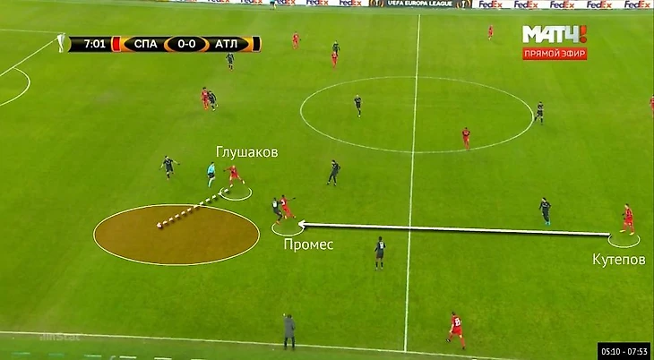 Один из вариантов взаимодействий «Спартака» на левом фланге атаки. Промес принимает передачу от Кутепова в полуфланге, провоцируя выход с позиции правого защитника «Атлетика» Де Маркоса. Зона за его спиной становится уязвимой, что пытается использовать Глушаков