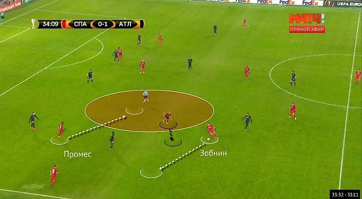 Во-первых, Промес по-прежнему стягивал на себя двух игроков. Он мог отвлечь на себя как любого из пары правофланговых игроков «Атлетика» Де Маркос – Уильямс, так и одновременно центрального полузащитника гостей Итурраспе. Это позволяло несколько освободить и левый фланг, и центральную область, где у «Атлетико» логично выпадал один из центральных полузащитников – либо реагируя на Промеса, либо персонально смещаясь широко во фланг за центральным полузащитником «Спартака».