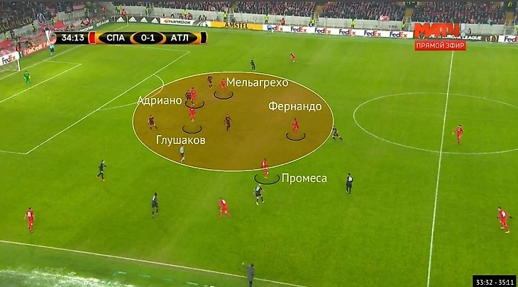 Однако минусом конечной фазы атак «Спартака» через центр было стремление «перегружать» полупозиции. Минимум три игрока хозяев занимали зоны между защитниками «Атлетика»: Адриано, Мельгарехо (а после Зе Луиш) и примыкавший к ним Глушаков. Минусом было то, что до выхода Зе Луиша ни один из них не был достаточно активен в маневре в глубину, чтобы попытаться увести за собой защитника соперника и поспособствовать возникновению разрывов в оборонительной линии.