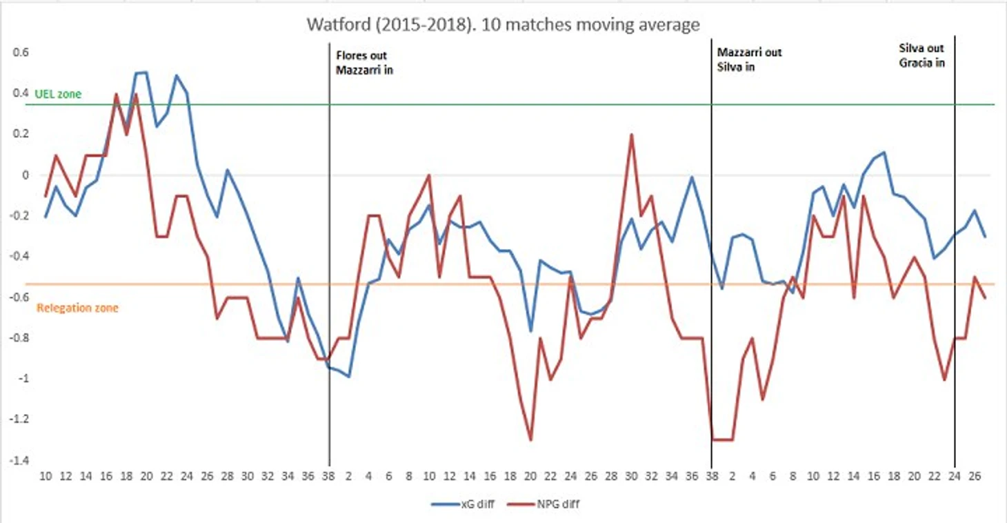 Изучение 10-матчевой скользящей средней позволяет лучше отследить динамику – в середине первого круга «Уотфорд» действительно играл качественнее, чем под конец периода Силвы. В зоне еврокубков они на коротком отрезке за счет дисперсии – по качеству не приближались к этому уровню. Потом закономерно постепенно начали опускаться. В точке увольнения Силвы команда была не хуже, чем на протяжении большей части периода нахождения в АПЛ после возвращения в 2015 году. При этом она имела результаты хуже, чем предполагал баланс моментов – менее зашумленная метрика. Были весьма серьезные основания ожидать улучшения результатов. И проблемы «Уотфорда» в первую очередь были связаны с реализацией – параметром, который главный тренер контролировать не может. То есть серьезного повода увольнять Силву, тем более на основании достаточно короткого отрезка матчей, не было.