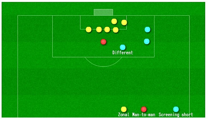 Ближняя штанга излишне защищена – там двое, а иногда и трое в зоне. Перед ними шеренга из четырех человек по линии вратарской. Еще двое реагируют на возможный короткий розыгрыш, один в полупозиции – либо под короткий, либо вторым в персоналку, либо третьим в зону на ближней. В результате сразу два уязвимых места: