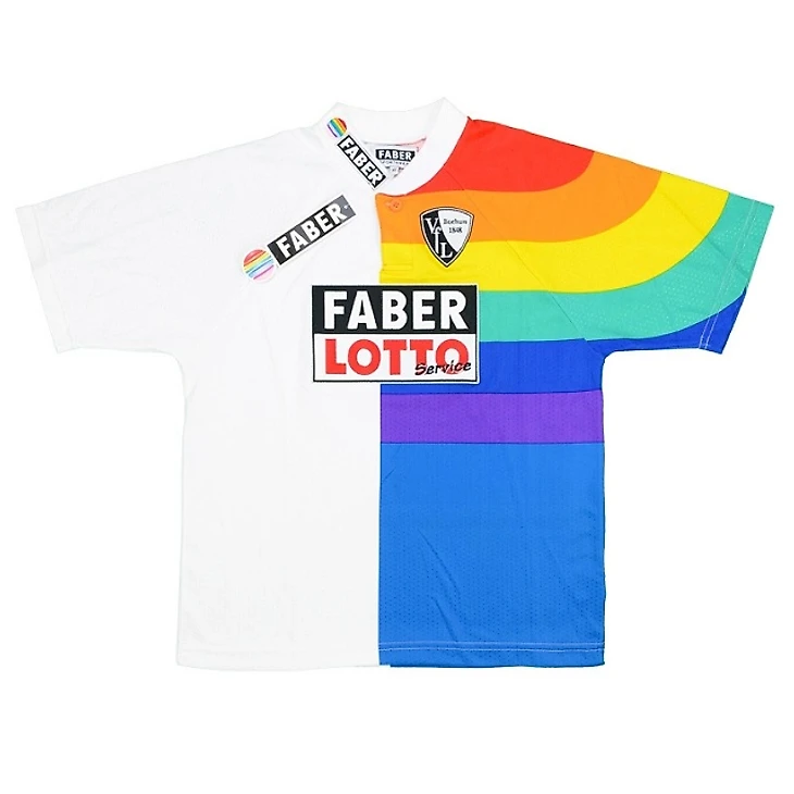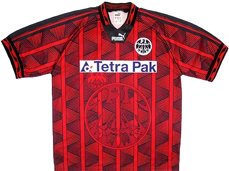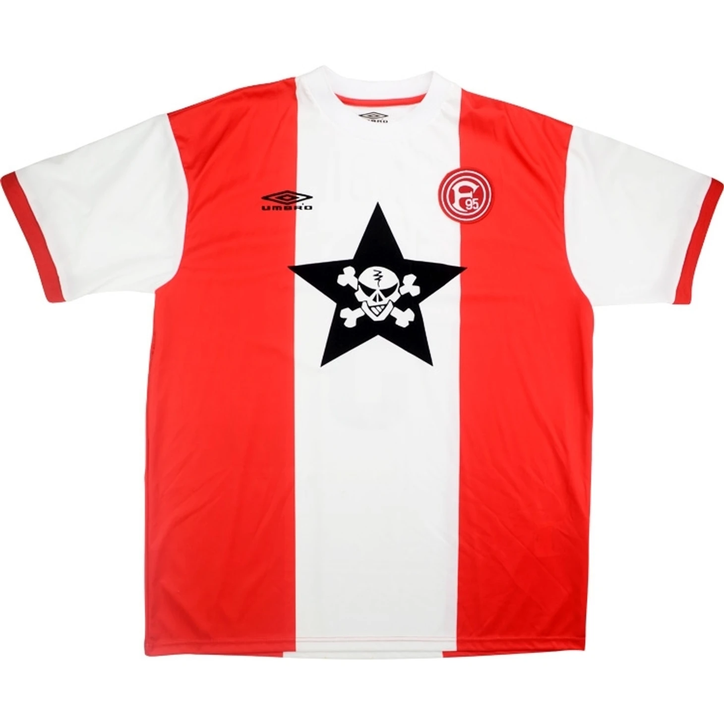 Не каждый день можно встретить футбольную форму, да еще с эмблемой панк-рок группы на месте титульного спонсора. Черная звезда группы Die Toten Hosen отлично сочетается с винтажным красно-белым дизайном.