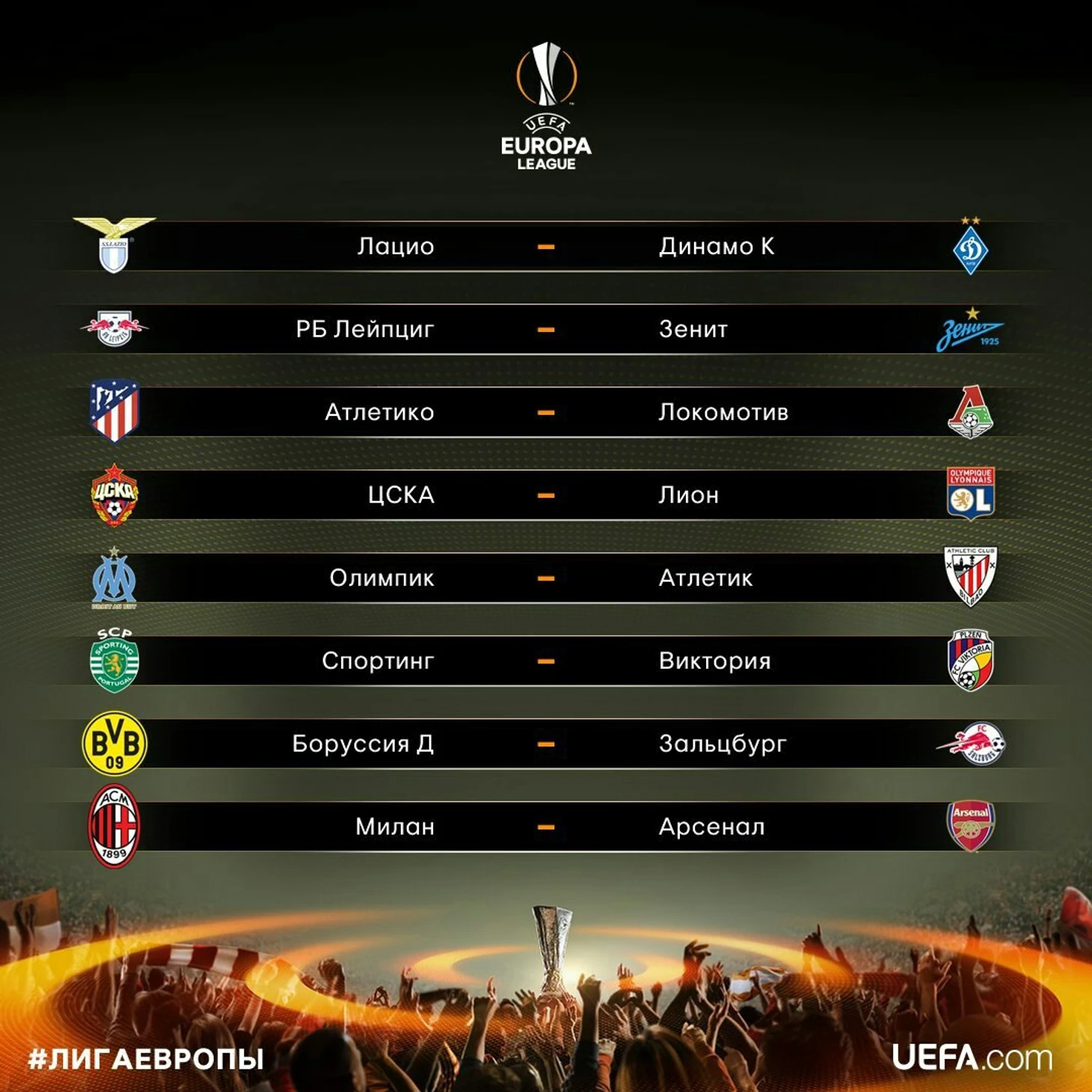 Остальные пары 1/8 финала:«Лацио» — «Динамо» Киев; «Марсель» — «Атлетик»; «Спортинг» — «Виктория Плзень»; «Боруссия» — «Зальцбург»; «Милан» — «Арсенал»