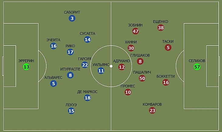 Выбор состава Карреры на матч с «Атлетиком» вновь остался не до конца понятным. По сравнению с игрой в Москве тренер сделал сразу 4 изменения. Главный вопрос возник по переформатированному центру поля, где перестановки были наиболее глобальными: как в зоне под нападающим, так и в опорном блоке. Сменились все, что удивительно, поскольку в сочетании Глушаков – Пашалич – Ханни «Спартак» не играл ни разу. Даже на сборах.